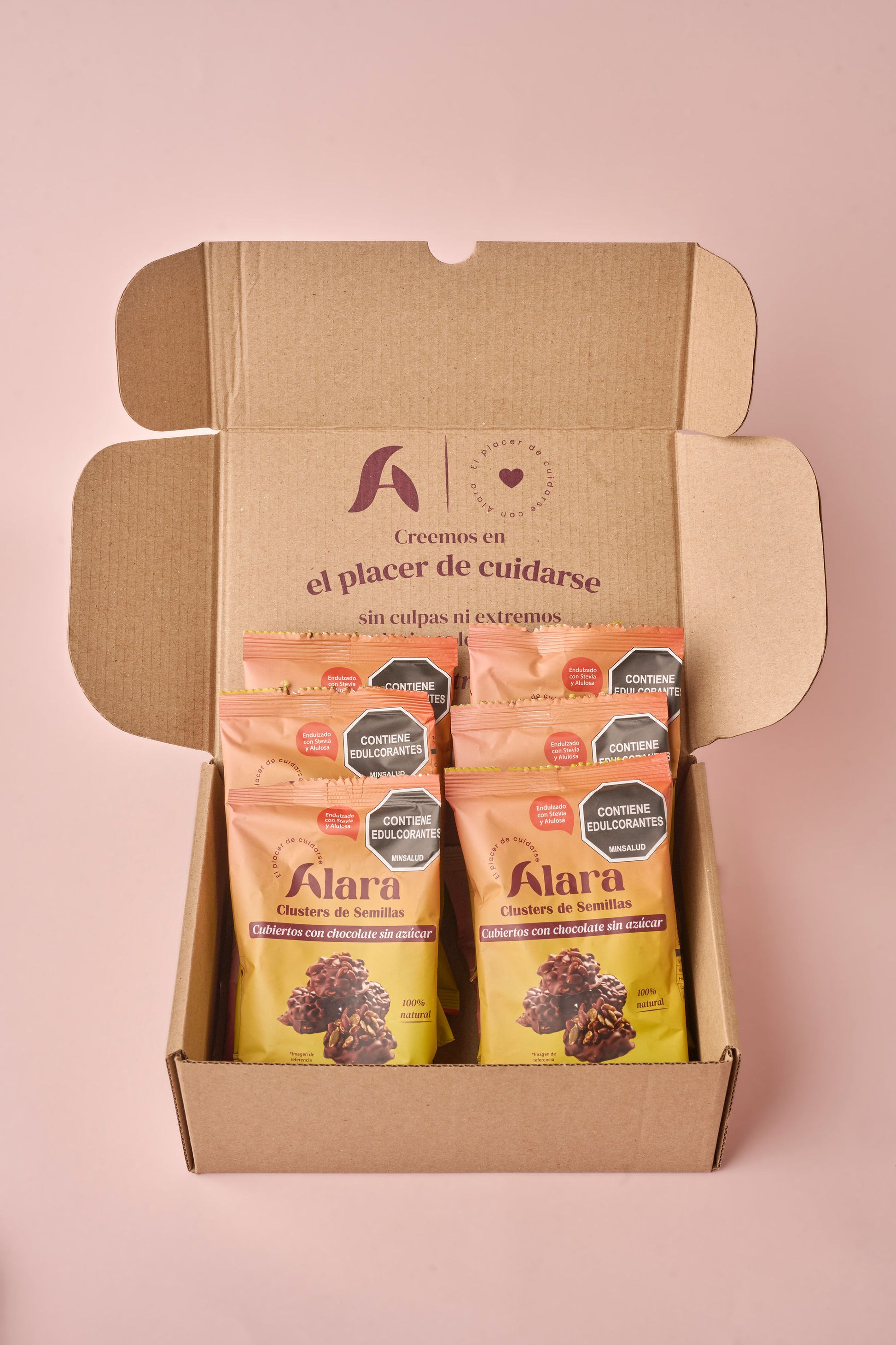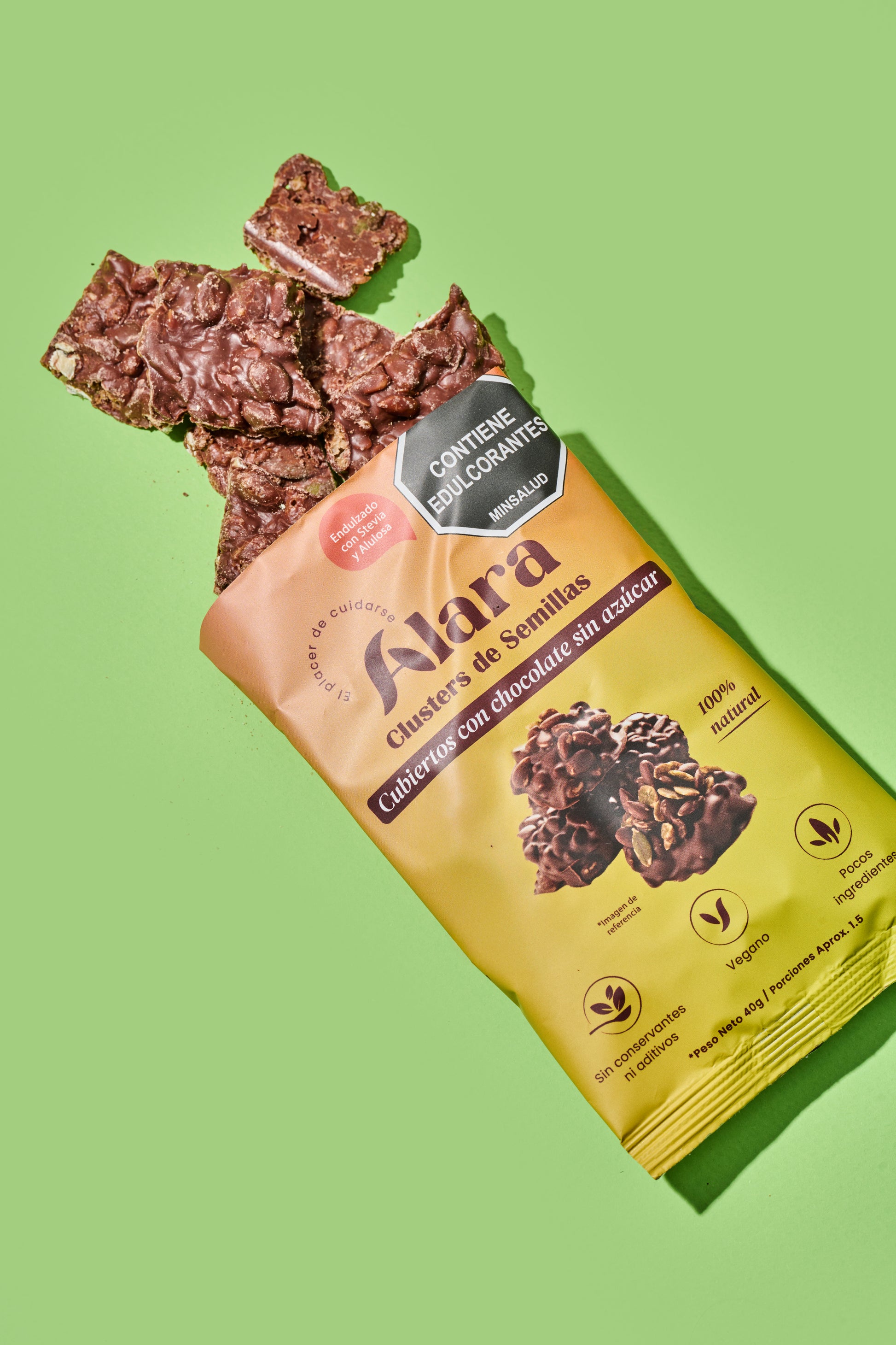 Clusters de semillas cubiertos en chocolate oscuro sin azúcar, hechos con ingredientes 100% reales, sin conservantes ni aditivos. Este mix delicioso y nutritivo combina semillas de calabaza, linaza, girasol y arroz soplado, que te aportan: